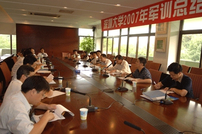 10月11日下午,深圳大學2007年軍訓總結大會在辦公樓201會議室召開。校黨委書記江潭瑜、副校長邢鋒參加了會議。 武裝部楊平部長總結了我校今年軍訓工作。我校今年有5637名學生參加了軍訓,分別在廣東陸軍預備役高炮師教導大隊、武警廣州指揮學院和深圳警備區預備役防化團三個基地接受封閉式訓練。楊平介紹了今年軍訓的特點: 一、采用按學院編隊、男女混編的編隊模式,取得很好效果。這種編隊方...