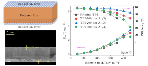 此外,在具有高玻璃化轉(zhuǎn)變溫度(Tg)的熱塑性聚酰亞胺(TPI)薄膜表面采用物理氣相沉積技術(shù)(PVD)沉積氧化鋁(Al2O3)鍍層, 制備了有機(jī)/無機(jī)三明治結(jié)構(gòu)的Al2O3/TPI/Al2O3電介質(zhì)薄膜。氧化鋁鍍層不僅與TPI之間具有優(yōu)異的界面結(jié)合性, 同樣提高了肖特基勢壘, 抑制了電極電荷的注入, 從而降低了高溫下的漏電流, 并提高了擊穿強(qiáng)度。制備的Al2O3/TPI/Al2O3三明治結(jié)構(gòu)薄膜在高溫下獲得了優(yōu)異的放電能量密度(Ud)和充放電效率(η)。在150和200 ℃高溫下,η> 90%時的Ud分別達(dá)到4.06和2.72 J/cm3, 相比純TPI薄膜提升了98.0%和349.4%.