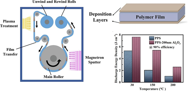 圖1. 卷對卷磁控濺射工藝制備的PPS/Al2O3高溫電容膜示意圖及其性能表征。