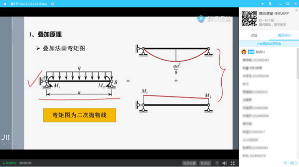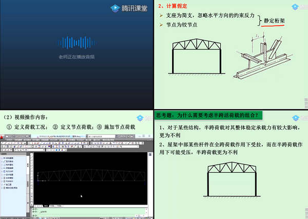 4月2日,第三場線上教學觀摩課是由土木與交通工程學院陳賢川老師主講的《結構力學A(1)》,本課堂使用的線上教學平臺為騰訊課堂。陳老師的課堂富有儀式感,在上課前線上播放上課鈴聲,提醒同學們按時進入課堂。隨后陳老師簡要回顧了上一節課的內容,引出本課堂的重點內容,并分為三部分講解。陳老師利用AutoCAD軟件,演示了屋架設計,十分直觀生動。為了使同學們更好地掌握原理和運用原理,陳老師不僅在騰訊課堂上進行講解,還同時在學習通平臺上發布題目,讓學生在線答題,并與學生互動答疑。