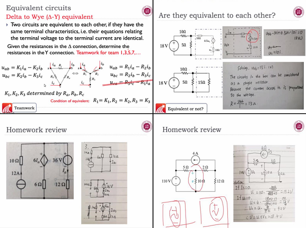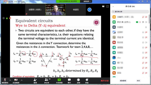 3月26日,第一場線上教學觀摩課是機電與控制工程學院費躍農老師主講的《電路分析》。費老師首先回顧了上節課布置的課后作業,指出了作業中存在的問題,并邀請同學們一起語音討論。課堂上,費老師采用全英文的PPT授課方式,以解答、鞏固、應用為主,將深奧的知識由淺入深的進行剖析。同學們積極互動,發言此起彼伏,整個線上課堂氣氛十分活躍,線上交流方便快捷,比線下課堂的交流互動更加頻繁。同學們在老師的共享屏幕中,書寫問題答案,通過屏幕及時分享。費老師根據作業問題引入新的問題,對有疑問的同學進行及時解答。最后費老師使用ZOOM軟件的分組功能,對同學們進行了分組,并且不同分組的同學任務不同。