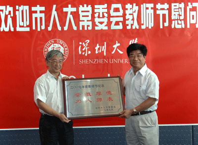 慰問團(tuán)向深圳大學(xué)贈送書有“崇教厚德,為人師表”的牌匾,并向優(yōu)秀教師代表送上鮮花和禮物,表達(dá)市人大常委會和全市人大代表的良好祝愿和崇高敬意。深大學(xué)生則向前來慰問的身為教師的市人大代表獻(xiàn)上鮮花。