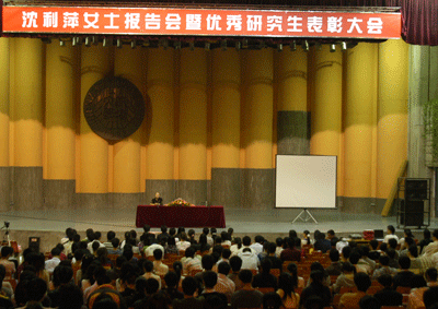3月12日晚上,沈利萍女士報告會暨優秀研究生表彰大會在演會中心隆重舉行。首屆中國十大杰出母親、中國十大巾幗英才---沈利萍女士為我校研究生講述了在她精心護理和教育下,十多年前遭遇空難下肢癱瘓的兒子王嘉鵬戰勝死神、創造了奇跡的感人事跡。隨后,沈女士和研究生部領導一起為獲獎的優秀研究生頒發證書。2006級、2007級研究生和獲獎研究生;研究生部、管理學院、生命科學學院部分領導出席了報告會。