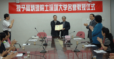 周炳琨院士說,他非常看重深圳大學這個名譽教授的頭銜,雖然自己已不在教學第一線,但會盡自己所能讓這個名譽教授名符其實。他表示在以后會做到關心深大、宣傳深大、學習深大。他表示:第一、辦好一個學校,師資建設非常重要,他會為深大推薦一些好的人才。第二,深大是改革開放三十年里高校的排頭兵,深大的辦學理念全面體現了改革開放、解放思想,深大用其文化影響了深圳。他會盡力宣傳深大的各個方面。第三,學習深大的辦學理念與文化特色,他相信,到2020年深大一定能夠實現建成知名的、有特色的教學科研型大學的目標,他會為這個目標的實現盡自己的一份力。