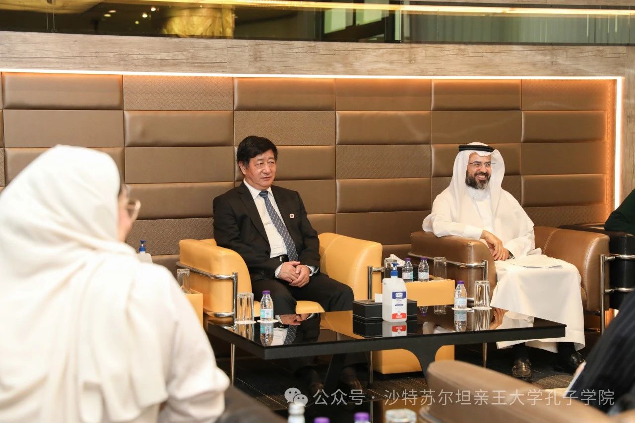 參觀結(jié)束后,代表團與孔子學院師生進行親切座談。沙特孔院中文教師張爔詳細匯報了孔院一年來在中文教育和文化推廣方面取得的成績。孔院中方院長張新穎介紹說,目前孔子學院開設的中文課程受到當?shù)貙W生的熱烈歡迎,已有三名學生通過了HSK2級考試。他們不僅在語言學習上取得了優(yōu)異成績,還積極參與了孔院首次組織的漢語橋春令營等文化交流活動,展現(xiàn)了沙特學生對中國文化的濃厚興趣。