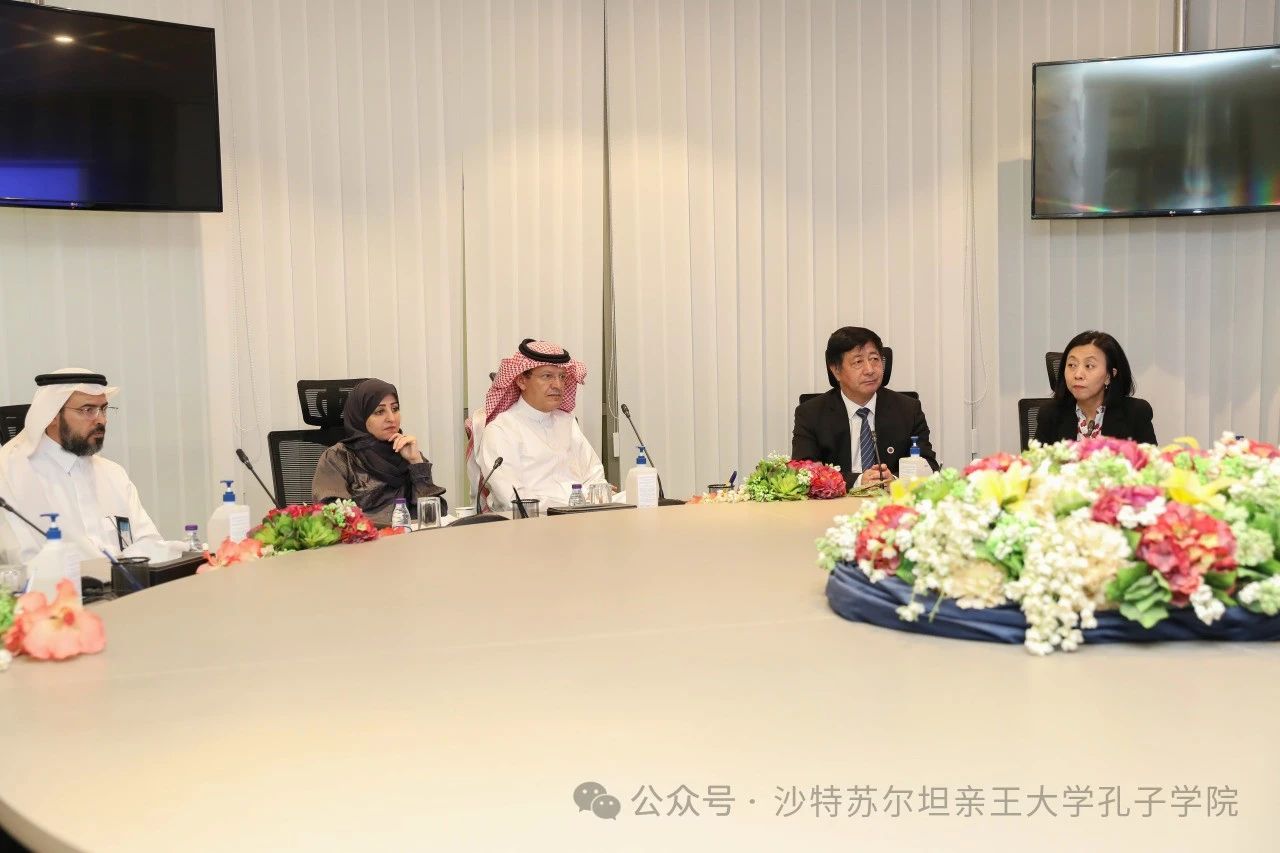 上午9點,深圳大學代表團一行抵達蘇爾坦親王大學,代表團受到蘇爾坦親王大學校長Armed Yamani博士的熱烈歡迎,并在蘇爾坦親王大學學術事務副校長Mohamad Aljebreen博士、女校校長Heba Khoshaim博士、國際部主任Tasneem Alsaati女士、沙特蘇爾坦親王大學孔子學院(簡稱“沙特孔院”)中外方院長、各學院院長的陪同下進行會面。
