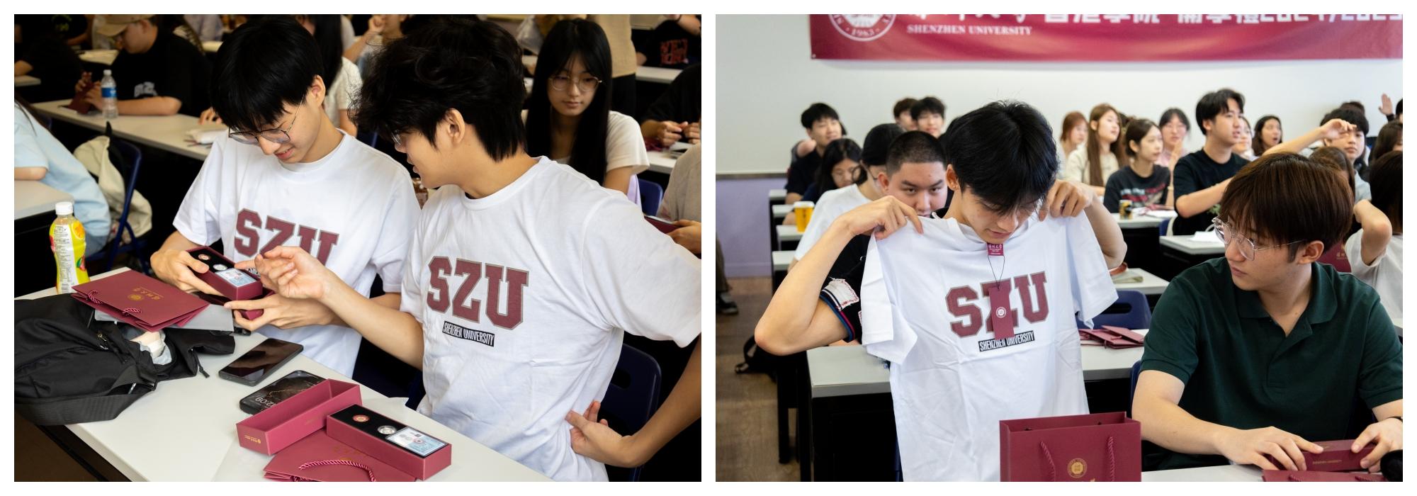 深圳大學代表團還為香港學院學生贈送了校徽和校園文化衫。新生代表李嘉晟在發言中表示,作為深圳大學香港學院的第一屆本科生,他深感自豪。深圳大學建立香港學院是為香港青年提供優質高等教育資源的一次全新探索,既是時代的機遇,也是香港青年成長與發展的新起點。他希望通過四年的學習不斷提升綜合能力,掌握扎實的學術知識,習得豐富的實踐技能,與同學們攜手并進,用“千磨萬擊還堅勁”的精神砥礪前行、探求真理、追逐夢想。
