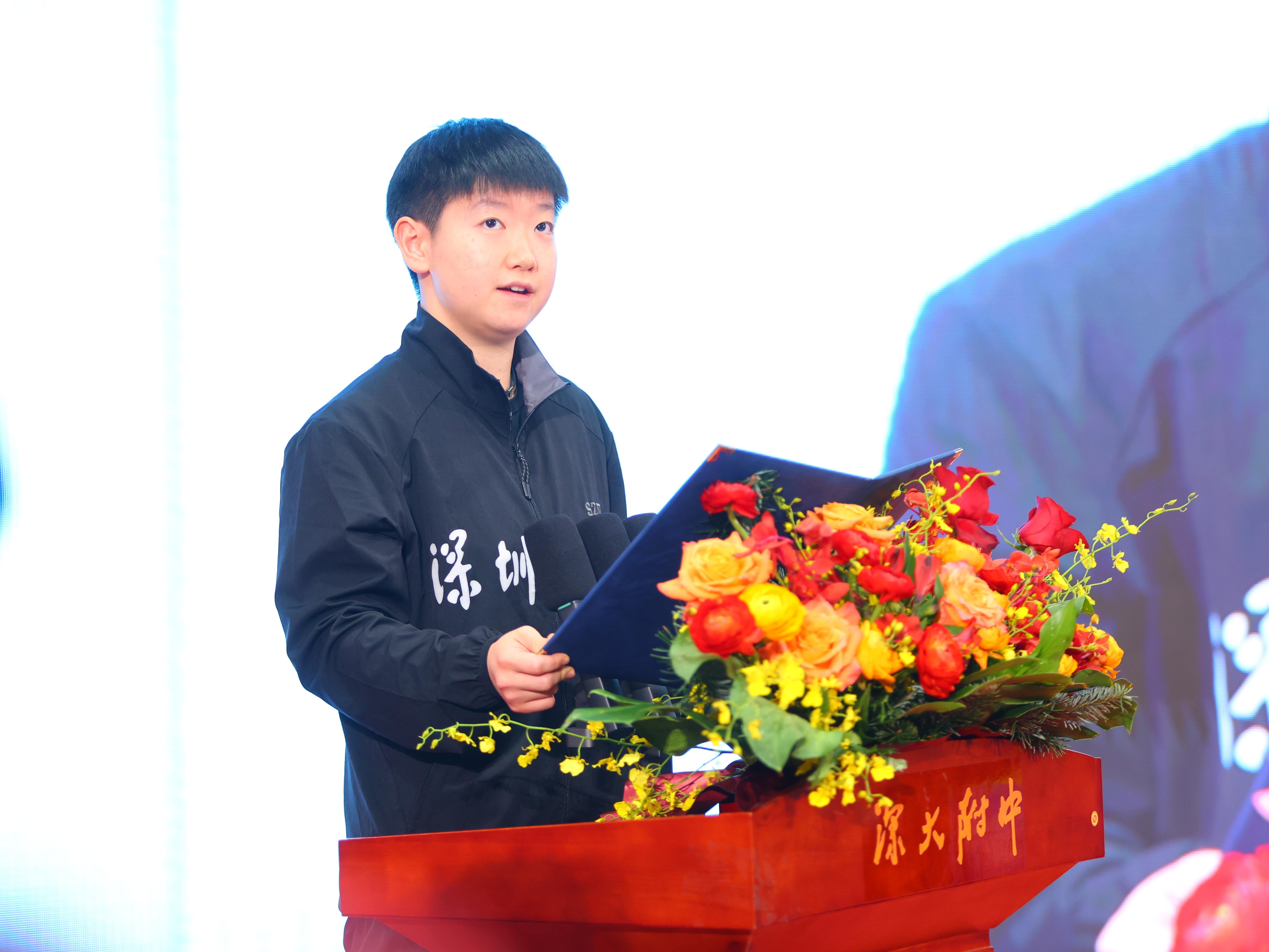 深大附中副校長邊海峰在致辭中表示,深大附中堅持體教融合,扎實推進“每天一節體育課”,貫徹落實立德樹人的根本任務,將大思政課延伸到校園的每個角落,讓學生在廣闊的天地中接受思想的洗禮和熏陶,實現身心的滋養和進步,努力成為有理想、有擔當、有拼搏精神的“拿云少年”。他希望深大附中的“拿云少年”以奧運冠軍為榜樣,在今后的學習生活中,直面困難和挑戰,用辛勤的汗水、堅韌的品格,為實現個人理想而持續奮斗,為祖國繁榮富強貢獻自己的青春力量。