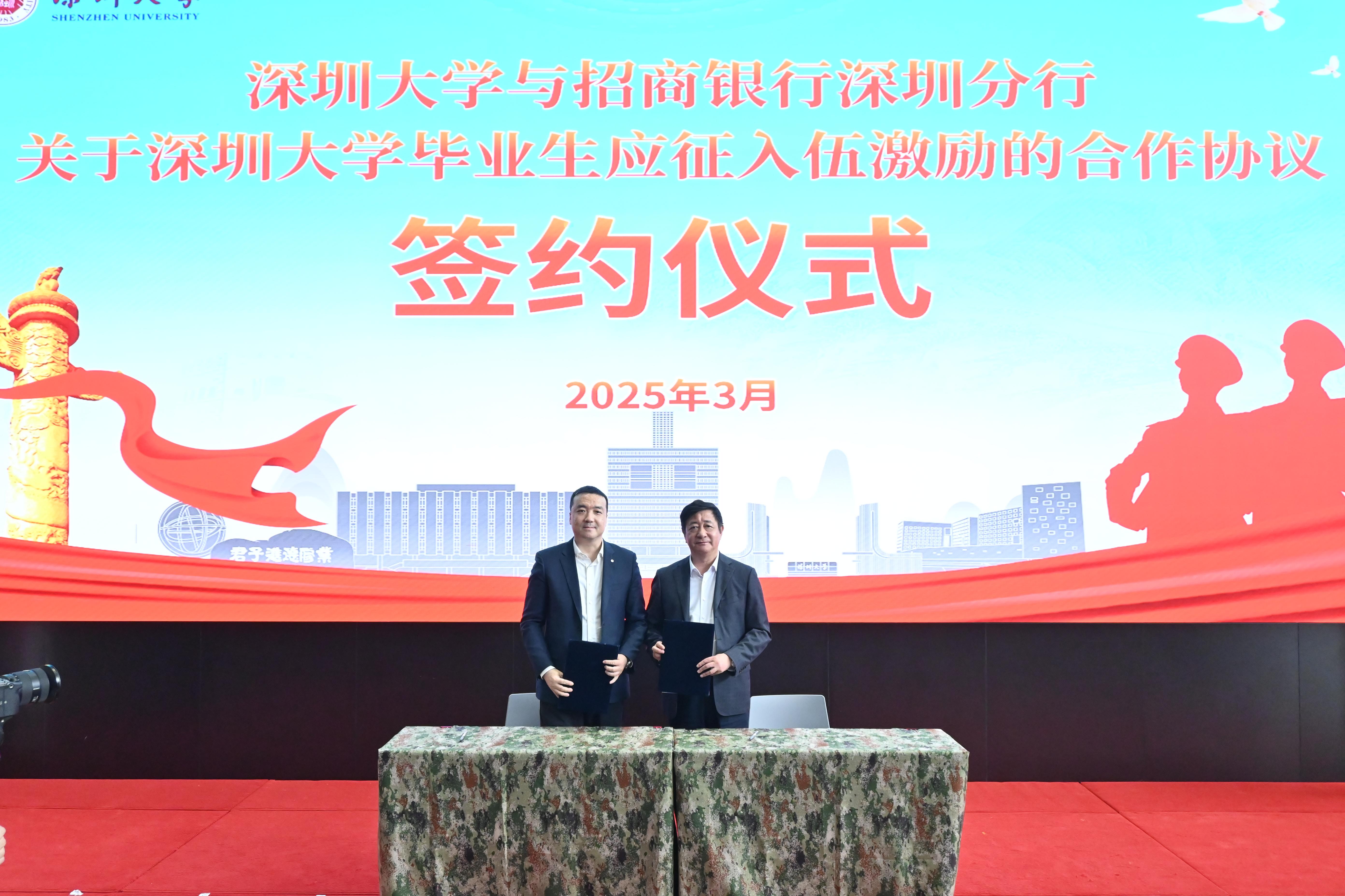 為助力國防教育的高質量發展,招商銀行推出“金葵軍夢”深圳大學畢業生征兵入伍激勵政策。儀式現場,深圳大學與招商銀行正式簽署《深圳大學與招商銀行深圳分行關于深圳大學畢業生應征入伍激勵的合作協議》,構建起“先就業再入伍”校企共育新模式。根據協議,符合條件的入伍學生可以提前與招行簽訂就業協議,招行將為其發放三年有效錄用通知書,簽約畢業生退役后可直接入行工作,入伍即鎖定職業發展通道,實現參軍報國與職業發展的雙向保障和良性閉環。雙方通過該合作鼓勵更多深大學子踴躍參軍,為部隊輸送優質兵員,同時也為招商銀行儲備具有軍事素養的高素質人才,共繪一幅“教育擁軍、金融助軍”的美好藍圖。