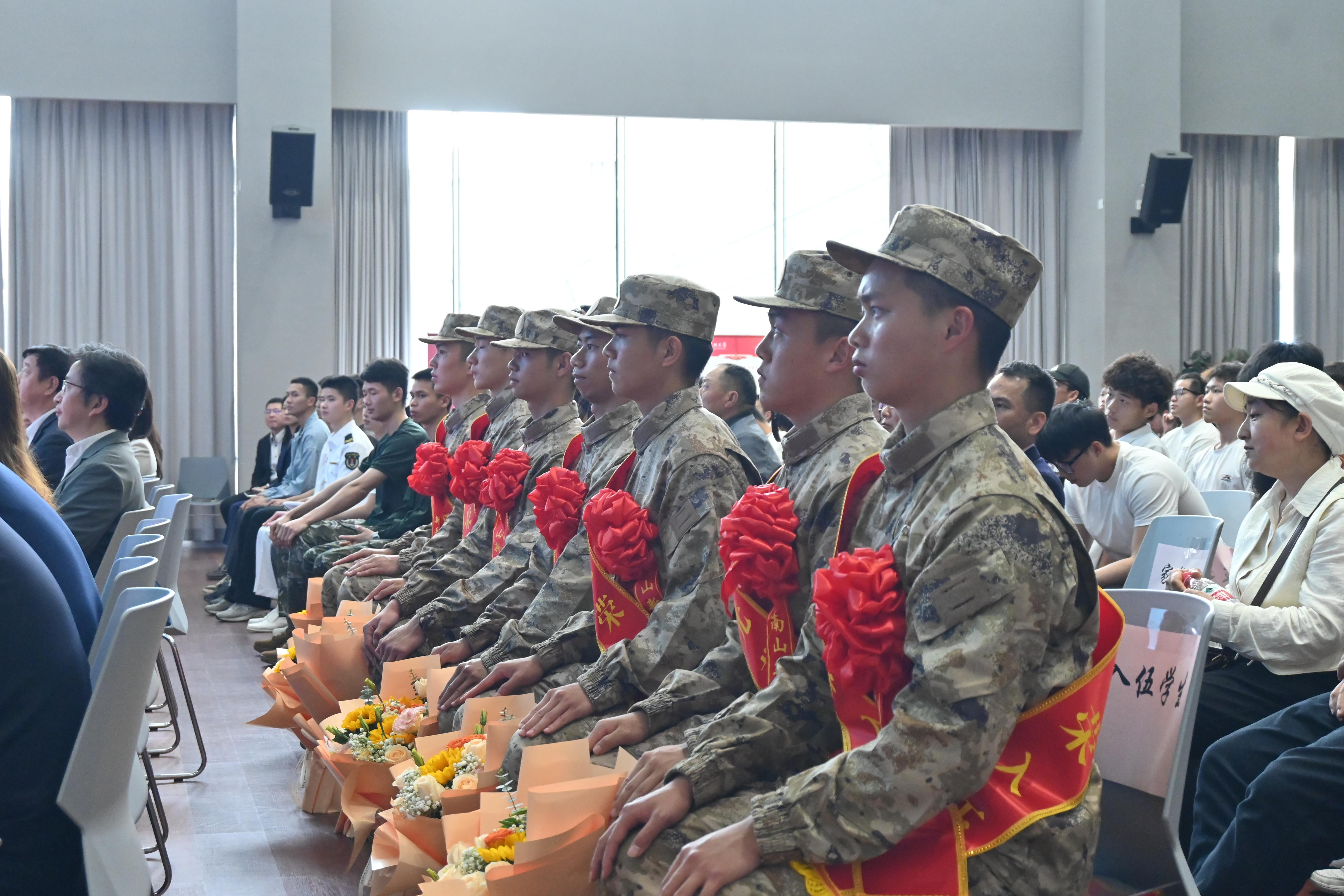 深圳大學副校長李永華、南山區人民武裝部領導、招商銀行深圳分行副行長杜兵出席儀式,招商銀行零售銀行部、南山科創支行綜合支行相關負責人,深圳大學學生部、深大社區、相關學院(部)分管學生工作領導,新兵家長、老師以及各院學生代表一同出席了儀式。