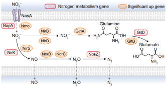 為進一步探索微生物群落中氮代謝功能的變化,本研究分析了與氮循環相關的代謝通路與功能基因,發現ICPB反應后與氮循環相關的代謝通路和功能基因豐度均顯著增加(圖5)。此外,本研究還推斷了ICPB系統中可能存在的硝酸鹽代謝途徑(圖6)。通過對反硝化代謝相關基因的定量分析,ICPB系統在基因水平上對氮的去除潛力得到了證明,這有利于進一步研究ICPB的反硝化機制。