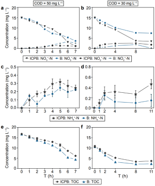 圖3 ICPB和生物降解(B)過程中NO3?, NO2?(a, b), NH4+(c, d) 和 TOC (e, f)的濃度變化