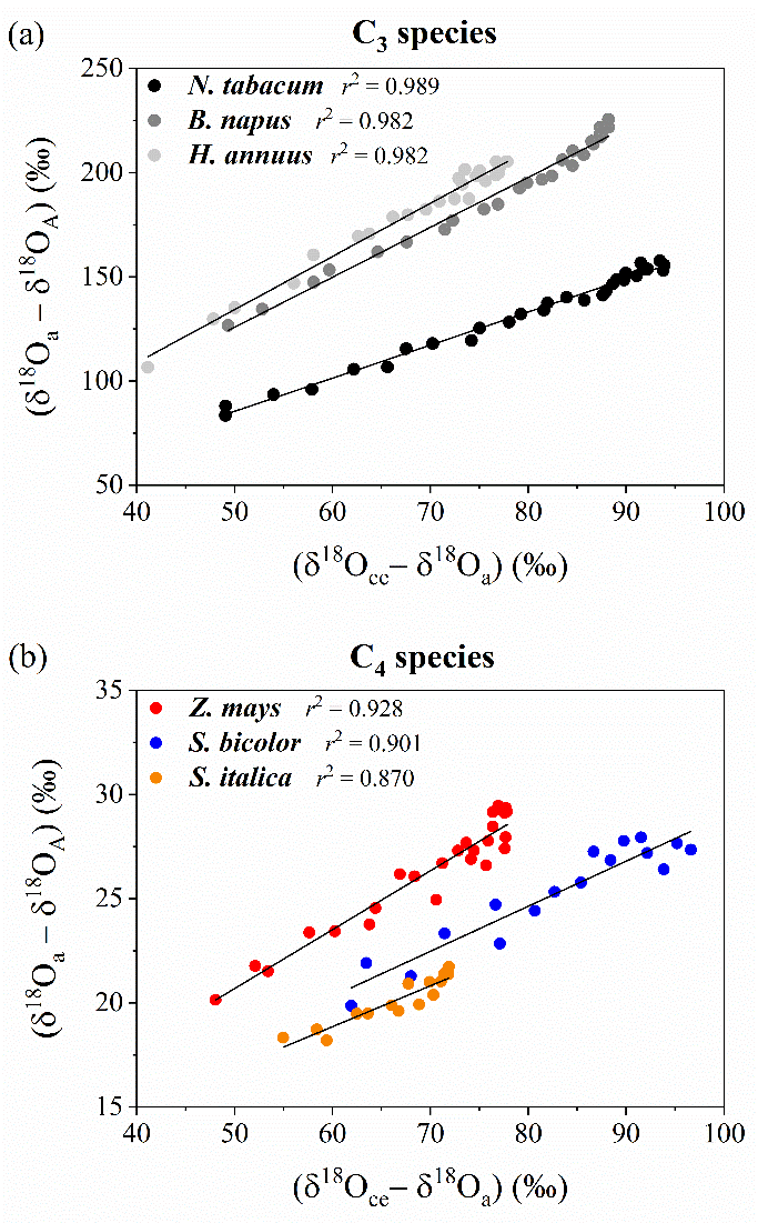 該研究聚焦光合作用過(guò)程中葉片內(nèi)部水分和CO2的同位素非穩(wěn)態(tài)過(guò)程,利用激光同位素光譜儀在線測(cè)定光合作用中CO2的氧同位素分餾(D18O),從而建立一種全新的、基于同位素非穩(wěn)態(tài)的線性回歸方法,同步測(cè)定葉肉細(xì)胞導(dǎo)度(gm)和葉肉細(xì)胞中水和CO2的氧同位素交換程度(q)。該研究為理解gm在作物產(chǎn)量提升和全球碳循環(huán)模型完善等研究領(lǐng)域的重要作用提供堅(jiān)實(shí)的理論基礎(chǔ)。宋欣教授是該論文的通訊作者,其團(tuán)隊(duì)成員饒森博士后為論文第一作者,四川農(nóng)業(yè)大學(xué)劉濤副教授(團(tuán)隊(duì)原博士后)以及澳大利亞詹姆斯×庫(kù)克大學(xué)Lucas A. Cernusak為論文共同作者。