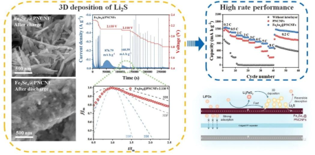 為解決鋰硫電池硫正極的電導率差、穿梭效應、Li2S不可逆沉積和鋰枝晶等問題,孫靈娜教授團隊通過靜電紡絲技術制備了Fe3Se4和多孔氮摻雜納米纖維的復合材料(Fe3Se4@PNCNFs),并將其作為鋰硫電池中間層來改善其電化學性能。研究表明Fe3Se4@PNCNFs對鋰硫電池充放電過程中產生的多硫化鋰中間產物有著較強的吸附和催化作用,能將多硫化鋰保留在正極側從而減弱穿梭效應。除此之外,在鋰硫電池充放電過程中,Fe3Se4會與多硫化鋰反應生成絡合物LixFeSy,其能促進Li2S的三維沉積來增強其可逆能力和倍率性能,這為鋰硫電池的性能改進提供了一條新的路徑和策略。該論文《Accelerating lithium-sulfur battery reaction kinetics and inducing 3D deposition of Li2S using interactions between Fe3Se4and lithium polysulfides》發表在《Journal of Energy Chemistry》(影響因子13.1,中科院JCR 1 區),深圳大學化學與環境工程學院碩士研究生林一涵為第一作者,孫靈娜教授為通訊作者,深圳大學化學與環境工程學院為通訊單位。