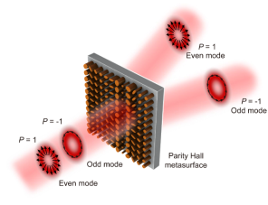 圖1 基于超表面實現的矢量模式宇稱霍爾效應示意圖。通過形狀雙折射超表面,將CVB的偶宇稱(P = 1)和奇宇稱(P = -1)模式分離到不同的方向。