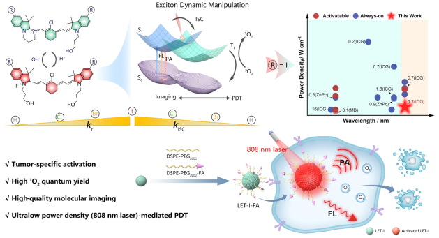 2024年6月,深圳大學醫學部生物醫學工程學院林靜教授團隊在國際頂級學術期刊Angew. Chem. Int. Ed.(影響因子16.6,中科院一區,TOP期刊)上發表了題為《Dissecting Exciton Dynamics in pH-Activatable Long-Wavelength Photosensitizers for Traceable Photodynamic Therapy》的研究論文。醫學部劉宇茸副研究員與碩士研究生張景(現為東京大學在讀博士)為第一作者,林靜教授為唯一通訊作者,深圳大學為唯一完成單位。該團隊開發了一類pH可激活的長波長花菁光敏劑分子用于可視化光動力治療(PDT)。這類光敏劑能夠被腫瘤酸性微環境特異激活,從而減少正常組織的光毒副作用,同時開啟NIR熒光(FL)和光聲(PA)雙模態成像。通過引入不同的鹵素調控分子的激子動力學過程,提高光電子的系間竄越(ISC)效率,從而提高單線態氧的量子產率,實現腫瘤高效可視化PDT。