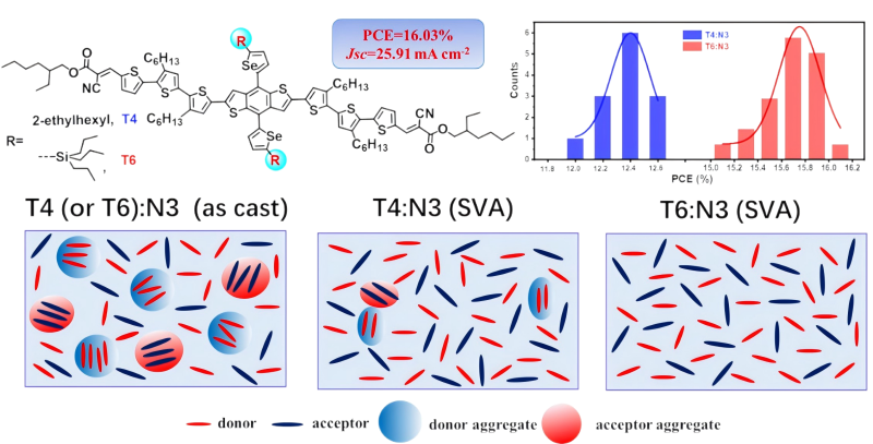 研究團隊發展了兩種新型小分子給體材料,分別命名為T4和T6。這兩種材料在共軛硒噻吩側鏈上分別引入了烷基取代基和三烷基硅基取代基。研究結果表明,不同的側鏈取代基對半導體性質、薄膜形貌以及器件效率產生了顯著影響。與T4相比,三烷基硅基取代的T6展現出更深的HOMO能級,并且吸收光譜略有藍移。當這兩種材料與受體N3混合時,所形成的共混薄膜表現出顯著不同的性質。未經處理的器件均表現出較差的性能,但在使用二硫化碳(CS2)進行退火處理后,相應器件的光電轉換效率顯著提高,主要得益于更快的激子生成速率和更有利的相分離,形成了互穿纖維網絡結構。特別值得一提的是,基于T6的薄膜器件實現了16.03%的PCE,明顯高于T4器件的PCE(12.61%)。與T4器件相比,T6器件PCE的提升主要歸因于以下幾點:首先,T6純薄膜具有更寬的吸收范圍和更深的HOMO能級,可能帶來更高的短路電流和開路電壓;其次,T6基器件表現出更好的激子解離率和電荷收集效率,且電荷遷移率更為平衡,受復合影響較小;最后,這些共T6:N3共混薄膜顯示出更強的π-π堆積效應和更有序的分子排列,以及更明顯的纖維狀互穿網絡結構,有利于電荷傳輸。該研究系統探討了側鏈工程和CS2退火對半導體性質和器件性能的影響,展示了側鏈工程和溶劑退火在提升光電性能方面的巨大潛力。
