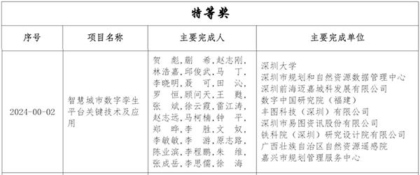 2024地理信息科技進(jìn)步獎(jiǎng)評(píng)選結(jié)果正式揭曉,由深圳大學(xué)建筑與城市規(guī)劃學(xué)院郭仁忠院士團(tuán)隊(duì)賀彪副教授牽頭,深圳市規(guī)劃和自然資源數(shù)據(jù)管理中心(深圳市空間地理信息中心)、深圳前海邁嘉城科發(fā)展有限公司等單位共同完成的“智慧城市數(shù)字孿生平臺(tái)關(guān)鍵技術(shù)及應(yīng)用”項(xiàng)目榮獲2024地理信息科技進(jìn)步特等獎(jiǎng)。
