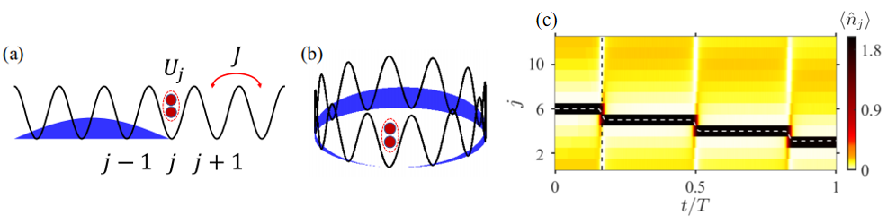 李朝紅-柯勇貫課題組在具有共同平移對稱性的多粒子體系中首次發(fā)現(xiàn)了相互作用誘導的連續(xù)譜中的多粒子束縛態(tài),并利用拓撲泵浦來動態(tài)調控連續(xù)譜中的多粒子束縛態(tài)。不失一般性,課題組考慮具有時間和空間周期調制相互作用的玻色-哈伯德模型。在開邊界條件下,連續(xù)譜中的三粒子束縛態(tài)表現(xiàn)為兩粒子束縛對局域在單粒子駐波的一側[圖(a)]。在周期性邊界條件下,強相互作用導致了平坦的三粒子能帶,通過構建多粒子萬尼爾態(tài)可以得到連續(xù)譜中的三粒子準束縛態(tài),其表現(xiàn)為兩粒子束縛對局域在單粒子駐波的波節(jié)處[圖(b)]。由于連續(xù)譜中的三粒子準束縛態(tài)是近簡并的多粒子布洛赫態(tài)的等概率疊加態(tài),近似為本征態(tài),在相當長的時間內(nèi)保持穩(wěn)定。將連續(xù)譜中的三粒子準束縛態(tài)作為初態(tài),通過動態(tài)改變相互作用可以實現(xiàn)其動力學調控[圖(c)]。經(jīng)過一個泵浦周期,三個粒子整體上移動了一個原胞的長度,與其對應的多粒子能帶的拓撲不變量一致。令人驚訝的是,在泵浦過程中單粒子流動方向與兩粒子束縛對流動方向相反。這是一種新的多粒子拓撲泵浦模式,完全不同于課題組之前預言的并被實驗證實的束縛態(tài)的拓撲泵浦以及拓撲共振隧穿。在之前的關聯(lián)拓撲泵浦中,所有粒子的運動方向相同。這些結果揭示了一般的相互作用多體系統(tǒng)中廣泛存在連續(xù)譜中的多粒子束縛態(tài),并提供了連續(xù)譜中多粒子束縛態(tài)的動力學調控方案,為系統(tǒng)地尋找連續(xù)譜中的多粒子(準)束縛態(tài)及其調控和應用鋪平了道路。