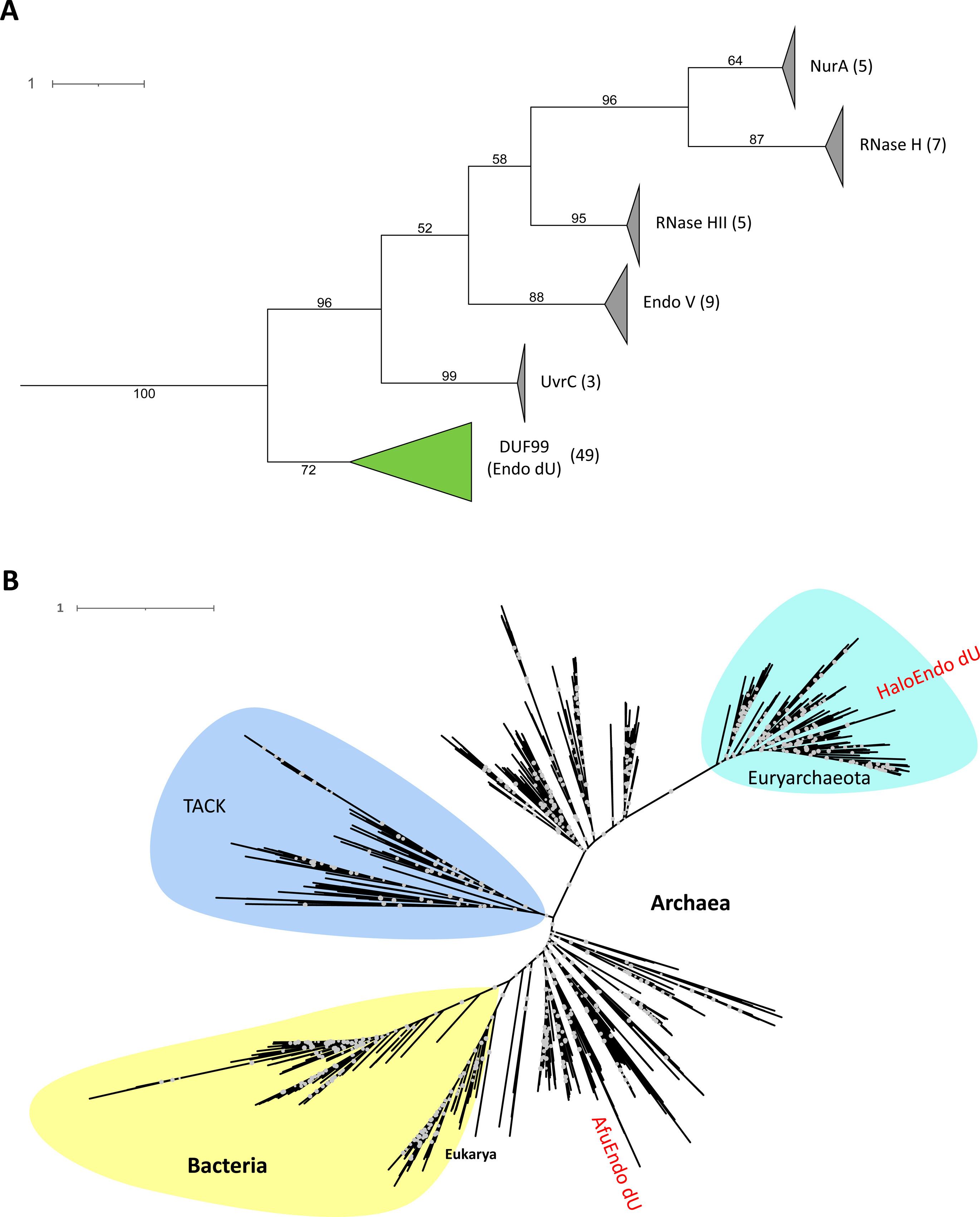 該研究揭示了含有未知功能域的蛋白質(zhì)家族DUF99能夠特異性識(shí)別并切割含脫氧尿苷的DNA底物,并將其命名為核酸內(nèi)切酶dU(Endo_dU)。通過(guò)系統(tǒng)發(fā)育分析,本文揭示了DUF99蛋白形成了一個(gè)與其它RNase H樣核酸酶蛋白不同的獨(dú)立單系群(圖1),并在嗜鹽古菌中與尿嘧啶-DNA糖基化酶(UDG)共定位,這暗示其可能與UDG酶共同參與到DNA修復(fù)的過(guò)程。生理生化實(shí)驗(yàn)結(jié)果表明,Endo_dU蛋白在一系列條件下展現(xiàn)出切割含脫氧尿苷的單鏈DNA的活性,其切割位點(diǎn)位于脫氧尿苷的3'端。