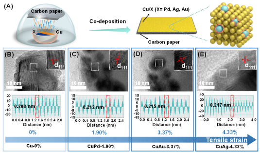 (5) 利用簡(jiǎn)單的雙金屬共蒸鍍策略,成功將少量異質(zhì)金屬原子(Pd、Au、Ag)引入銅晶格中。基于異質(zhì)原子與Cu原子之間的原子半徑差異,成功構(gòu)建了不同晶格拉伸應(yīng)變程度的Cu基催化劑,有效改變了活性位點(diǎn)的電子結(jié)構(gòu),影響關(guān)鍵反應(yīng)中間體的吸附行為,從而提升CO2電還原的多碳產(chǎn)物的選擇性。該成果以“Heteroatom-induced tensile strain in Copper lattice boosts CO2electroreduction toward multi-carbon products”為題,發(fā)表在Carbon Energy(IF=19.5),碩士研究生翟志揚(yáng)為第一作者。