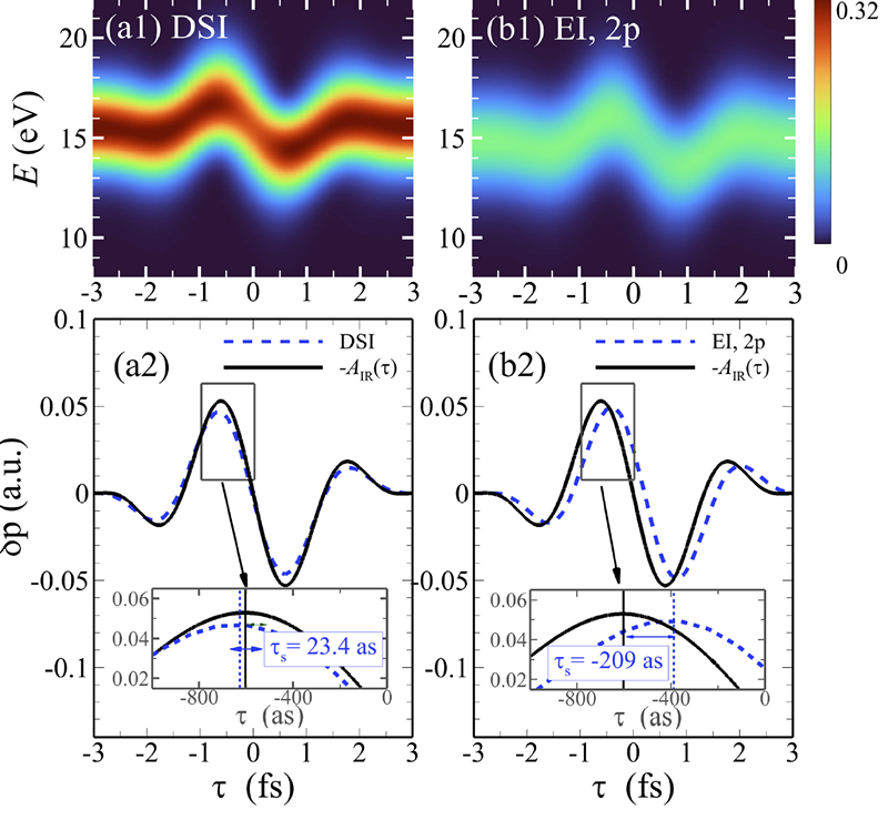 圖1:直接電離通道(DSI)與激發電離通道(EI)的阿秒條紋譜。