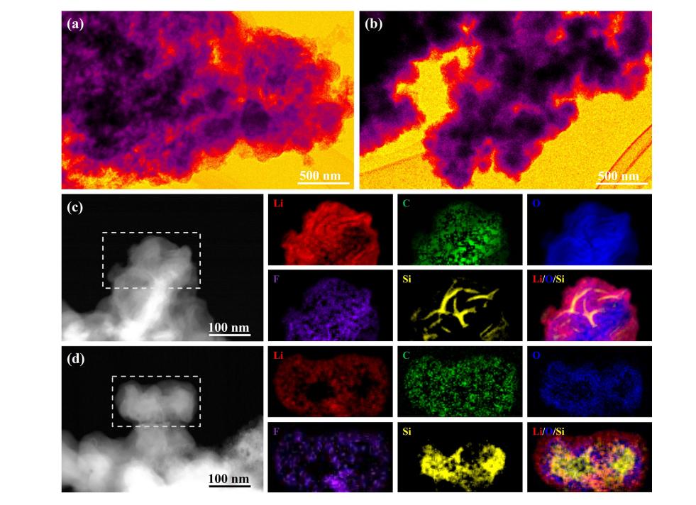硅(Si)是下一代高能量密度鋰離子電池負極材料的理想選擇,但其體積的顯著膨脹使其穩定性難以達到令人滿意的程度。在此,作者證明了在測試期間,當硅納米顆粒的鋰化深度控制在 2000 毫安時/克或更低時,未觀察到容量衰減;在合適的鋰化深度調節下,硅負極薄膜的斷裂得到了很好的緩解,并且循環后的硅仍保持顆粒狀,而不會像完全鋰化時那樣變成絮狀。此外,在鋰化深度調節下形成的以氟化鋰為主的外層固態電解質界面(SEI)比完全鋰化時形成的馬賽克型 SEI 更能鈍化硅負極并防止電解質進一步分解。調節鋰化深度被證明是解決緊迫體積問題的可行方案,應像材料層面的優化一樣重視容量利用率的優化。