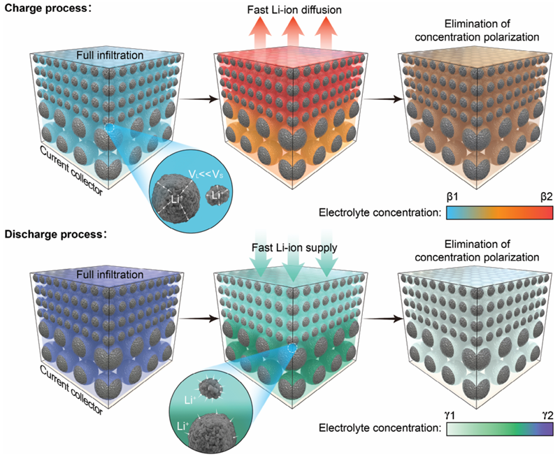 在該項工作提出了一種創新的雙層電極結構設計。通過采用不同尺寸的LiNi0.83Mn0.12Co0.05O2(NMC83)材料構建雙層電極結構,其中底層由大顆粒(11.3 μm),頂層由小顆粒(4.5 μm)組成,在經過充分浸潤后,電極內部電解液濃度分布均勻。在充電過程中,由于鋰離子擴散速度差異(VL<<VS),充電開始時小顆粒中的鋰離子快速擴散到電解液中,而大顆粒中的鋰離子擴散速度相對較慢。因此,電極內部形成濃度梯度,小顆粒附近的電解液中鋰離子濃度高,大顆粒附近的電解液中鋰離子濃度低。不過,小顆粒與電解液充分接觸,根據菲克定律,高濃度的鋰離子能夠快速擴散到電解液中,充電過程中消除了濃差極化。這種創新的雙層電極結構設計,構建了快速的電解液浸潤和鋰離子擴散通道,有效緩解了厚電極中的濃差極化問題。