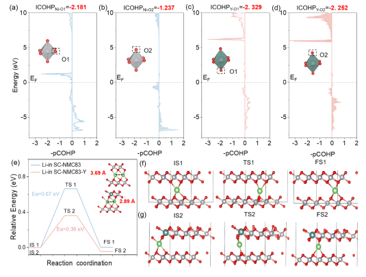 本工作通過摻雜Y元素抑制了單晶富鎳層狀正極材料的晶格氧釋放,構建了均勻的CEI層,有效防止了循環過程中從表面到體相的嚴重結構降解。該技術的亮點在于摻雜Y后的SC-NMC83陰極材料通過強Y-O鍵穩定了結構,SC-NMC83-Y表現出更強的可逆性,并有更加均勻的CEI層。通過Y的摻入,拓寬了Li+在正極材料中的擴散路徑,提高了鋰離子的擴散系數,降低了鋰離子的遷移能壘,成功的將鋰離子的遷移能壘從0.67 eV降低至0.36 eV。其中SC-NMC83-Y的ICOHP值為-2.329,低于SC-NMC83的-2.181,表明YO6的鍵強強于NiO6。這項工作對Y摻雜的深入理解有助于設計出穩定的高鎳單晶NMC正極材料,用于高能、高安全性鋰電池。