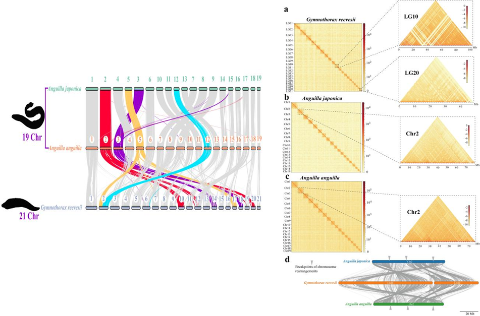 鰻鱺目魚類在生態學和生物進化研究中具有重要地位。它們長相奇特,譬如體長條、圓筒形,無腹鰭,皮膚光滑且少鱗或無鱗,鰓孔狹窄,一些海水鰻甚至沒有胸鰭(圖1)。此外,鰻鱺目魚類的染色體數目呈現多樣性,通常海水鰻擁有21對染色體(Zhang K.et al.,Scientific Data, 2023, 10:501),而淡水鰻只有19對染色體(圖3左)。因此,鰻鱺目為深入研究魚類的體型及染色體核型進化提供了理想材料。但目前相關研究還極其缺乏。