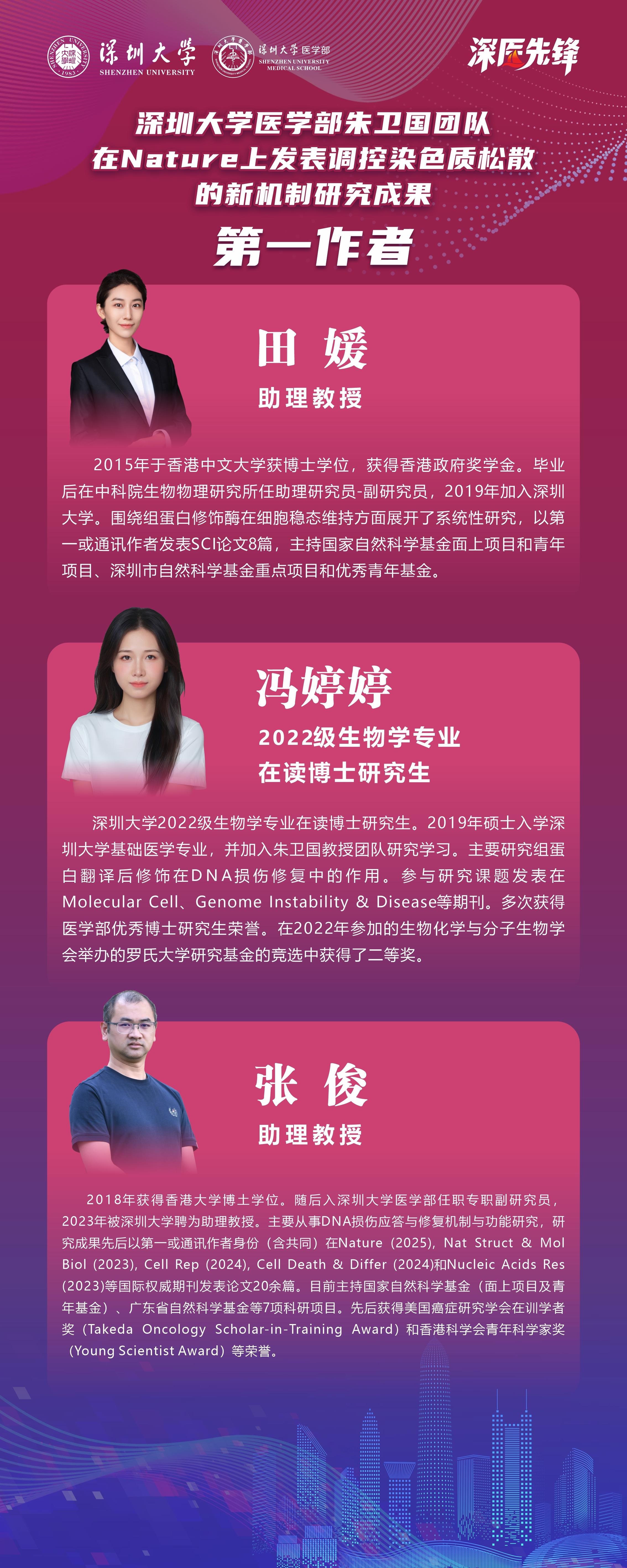 深圳大學講席教授、卡爾森腫瘤中心主任朱衛國為本文的通訊作者,深圳大學助理教授田媛、生物學專業2022級在讀博士研究生馮婷婷和助理教授張俊為本文的共同第一作者。合作者中除深大師生以外,同濟大學上海第一婦嬰醫院湯明、復旦大學腫瘤醫院劉超華、皖南醫學院束雨新及北京大學醫學部醫學遺傳系的張羽等也參與了該項研究。