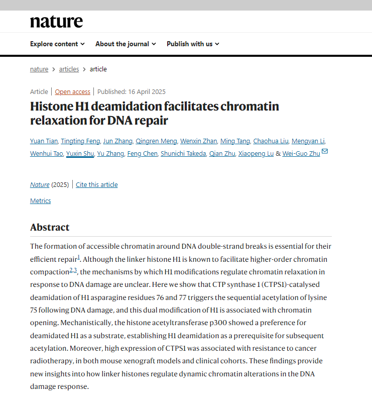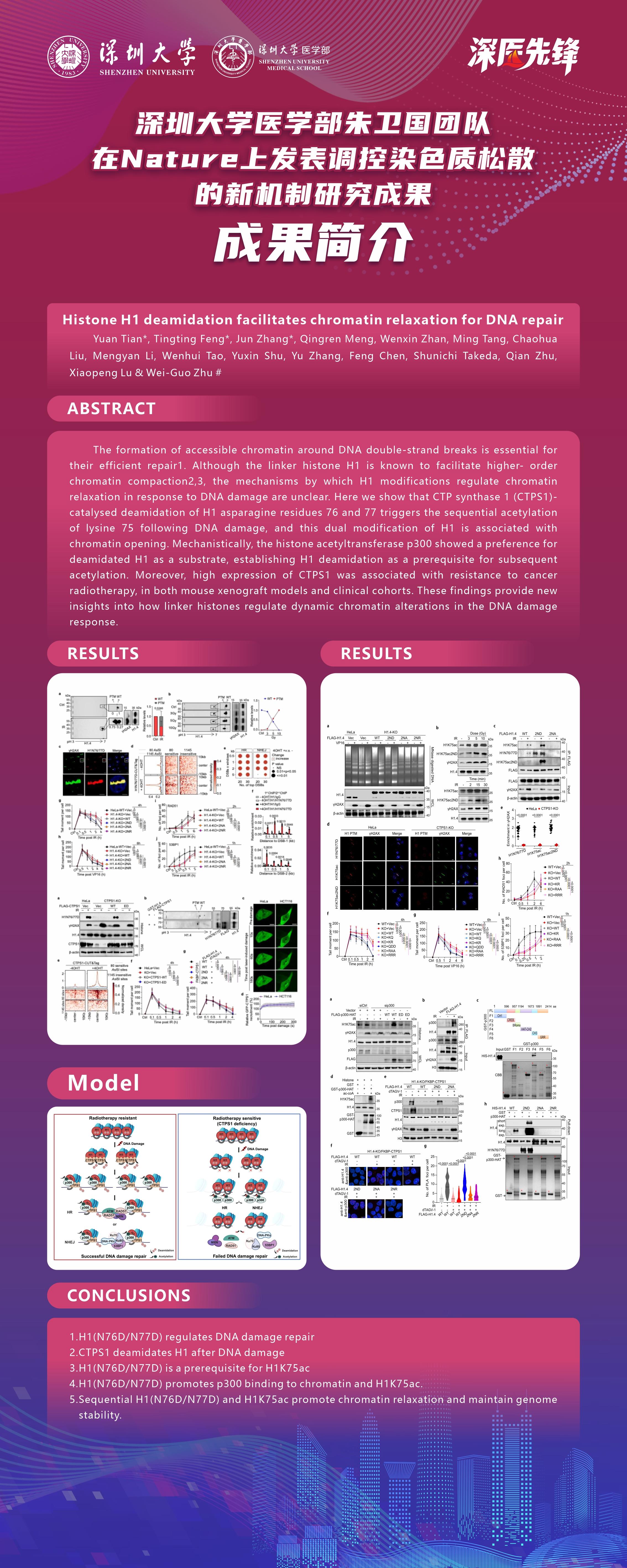 2025年4月16日,深圳大學醫學部基礎醫學院及卡爾森國際腫瘤中心朱衛國教授團隊在《自然》(Nature)雜志在線發表了題為“Histone H1 deamidation facilitates chromatin relaxation for DNA repair” 的研究論文,揭示了連接組蛋白H1脫酰胺化修飾(deamidation)促進染色質開放和DNA損傷修復的機制,為腫瘤放化療的精準靶標設計夯實了理論基礎,在腫瘤防治基礎研究領域取得突破性進展。