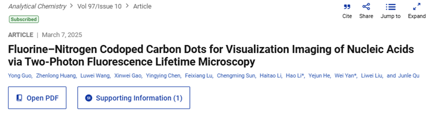 (2)題為“Fluorine-Nitrogen Codoped Carbon Dots for Visualization Imaging of Nucleic Acids via Two-Photon Fluorescence Lifetime Microscopy”的研究論文在Analytical Chemistry上發表。以2,4-二氟苯甲酸和甘氨酸為原料成功制備氟-氮共摻雜碳點(F-NCDs),以其為探針通過雙光子熒光壽命顯微鏡對核酸進行可視化成像研究。郭勇為該論文的第一作者,嚴偉和李灝為該論文的通訊作者,深圳大學為第一完成單位和通訊作者單位。