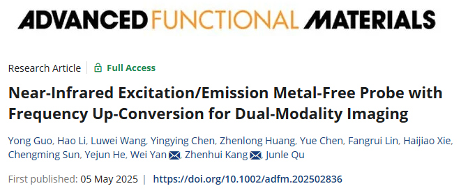 (1)題為“Near-infrared excitation/emission metal-free probe with frequency up-conversion for dual-modality imaging”的研究論文在Advanced Functional Materials上發表,并被列為“Hot Topic: Carbon, Graphite, and Graphene”熱點領域。設計并制備了一種具有頻率上轉換,近紅外激發和發射特性的探針用于多模態成像。中心博士后郭勇和揚州大學助理研究員李灝為該論文第一作者,深圳大學副教授嚴偉和蘇州大學教授康振輝為該論文的通訊作者,深圳大學為第一完成單位和通訊作者單位。