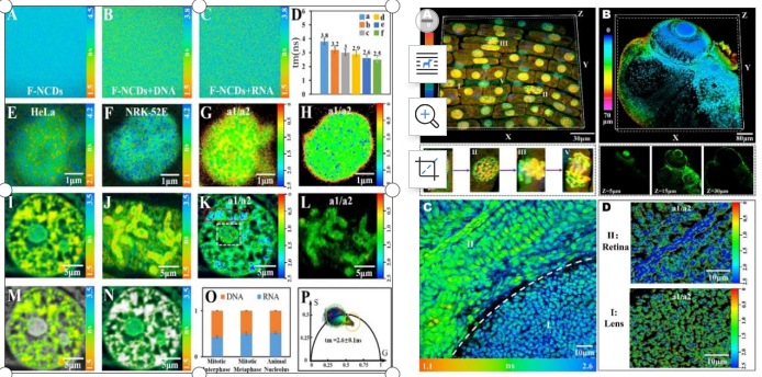 可視化活細胞中核酸(DNA和RNA)的形態和動力學是了解它們在調節生物體生長、發育和繁殖中如何發揮作用的關鍵。然而,目前缺乏能夠同時靶向DNA和RNA的有效探針,以及分析它們在生物體中的分布和相對比例的工具。因此,本研究成功制備一種具有雙光子吸收的氟-氮共摻雜碳點(F-NCDs),該F-NCDs表現出穩定的熒光、良好的生物相容性和對核酸(DNA和RNA)敏感的熒光壽命。以F-NCDs為探針結合雙光子熒光壽命成像技術(TP-FLIM)的多色成像能力來定量區分DNA和RNA在細胞核中的分布情況。該方法可以有效追蹤不同分裂階段植物細胞核(洋蔥根尖)中DNA/RNA分布的變化和區分動物組織(斑馬魚)的細胞種類。