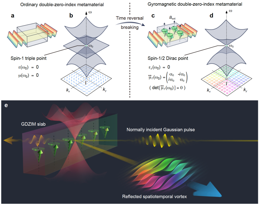 圖1. 傳統雙零折射率超材料與旋磁雙零折射率超材料對比,及利用旋磁雙零超材料產生時空光渦旋