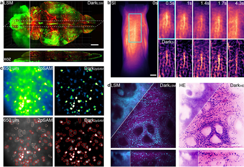 圖3. Dark sectioning的典型應用。(a)基于光片的小鼠全腦成像,(b)小鼠血管的小動物活體成像,(c)合成孔徑雙光子小鼠神經元成像,(d)前列腺組織三維光片成像與虛擬染色圖像。比例尺:(a)40 μm,(b)2 mm,(c)32 μm,(d)8 μm。